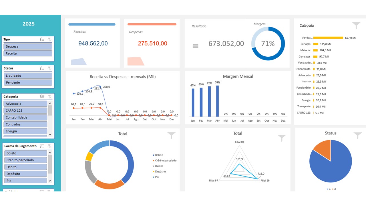 Dashboard Financeiro em Excel com gráficos, filtros e visão clara do fluxo de caixa. Prático, visual e essencial para sua gestão financeira.