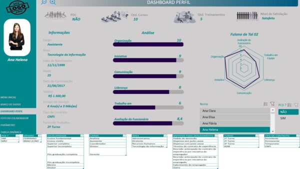 Além disso, ele oferece funcionalidades como um banco de dados completo, em que você pode registrar a satisfação dos colaboradores, histórico de treinamentos, avaliações de desempenho, cursos concluídos, entre outros pontos relevantes. Esses dados são atualizados de forma simples e, em poucos cliques, você visualiza tudo em um painel gerencial poderoso.