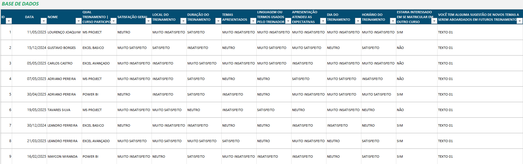 Esses dados alimentam automaticamente o painel visual, que exibe indicadores como Satisfação Geral, Local do Treinamento, Duração, Temas, Linguagem e Expectativas. Além disso, há cards interativos que mostram o total de cursos realizados, interesse em novos treinamentos, gênero dos participantes e horários mais comuns. Ou seja, tudo isso com filtros por curso, mês e ano, facilitando a análise de tendências e a tomada de decisões.