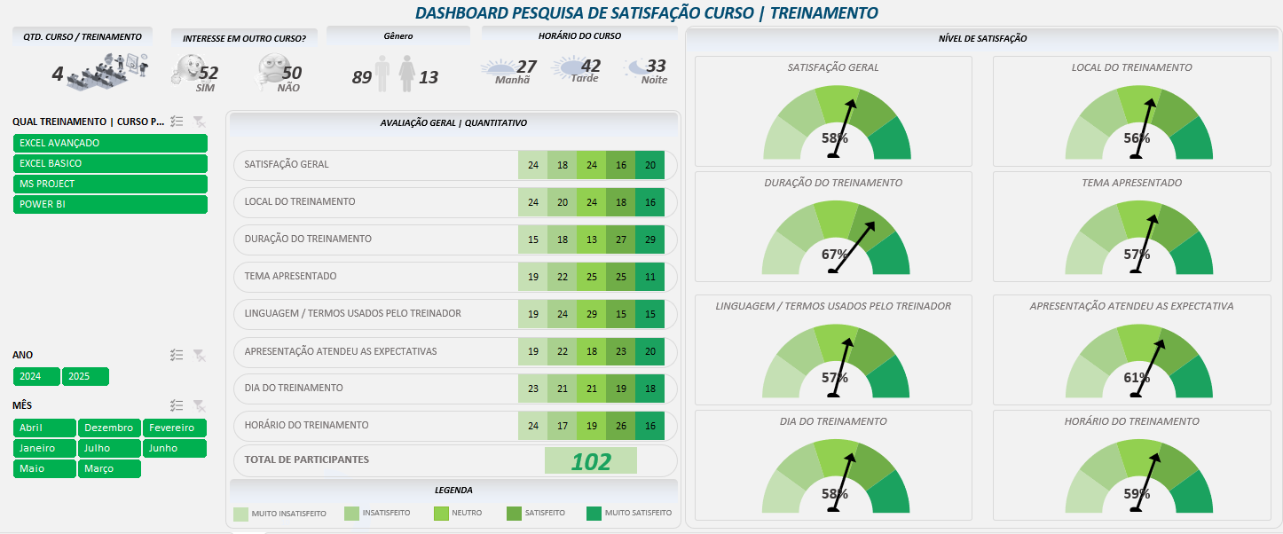 Sendo assim, baseando-se nisso, foi desenvolvido o Dashboard de Satisfação de Curso, uma ferramenta moderna que permite avaliar e visualizar, de forma clara e prática, o retorno dos treinamentos oferecidos. Ele é ideal para profissionais de RH, gestores de pessoas, instrutores e consultores corporativos que desejam acompanhar o impacto das capacitações com precisão e agilidade.