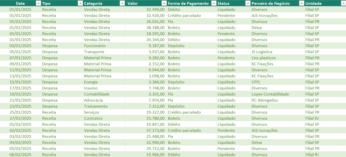 Data, tipo, categoria, valor e status;