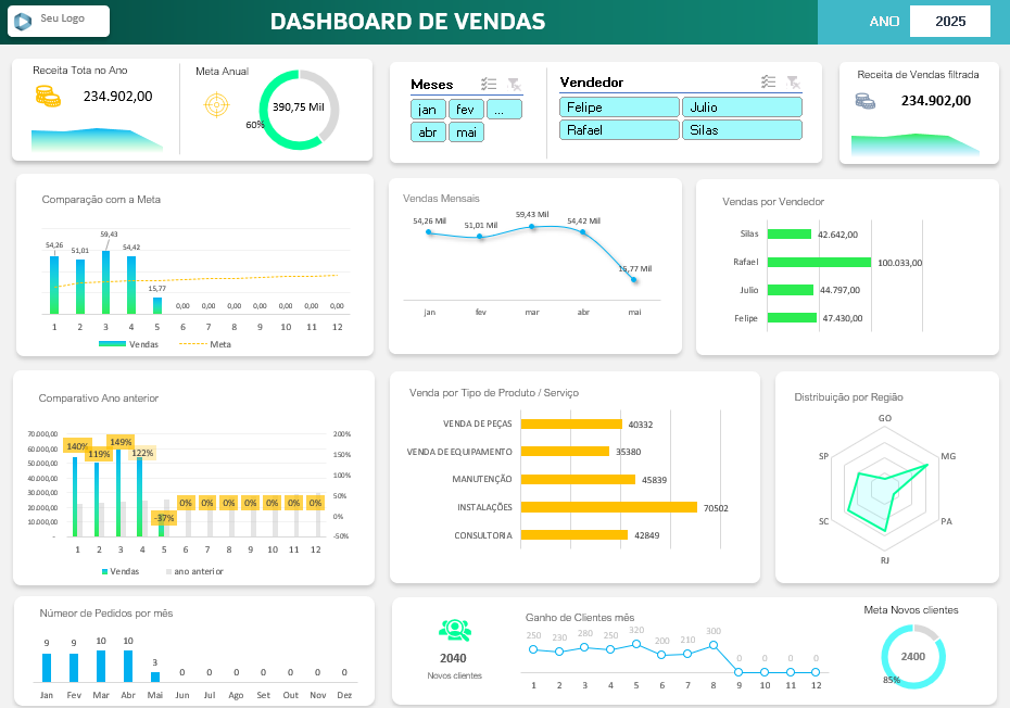 Desse modo, com essa ferramenta, você visualiza indicadores como a receita total no ano e o percentual de alcance da meta anual. A comparação entre metas e vendas mês a mês, além do volume de vendas mensais por produto, serviço, região e vendedor, está presente. Também é possível acompanhar a quantidade de novos clientes, pedidos realizados e comparar os resultados com o desempenho do ano anterior.