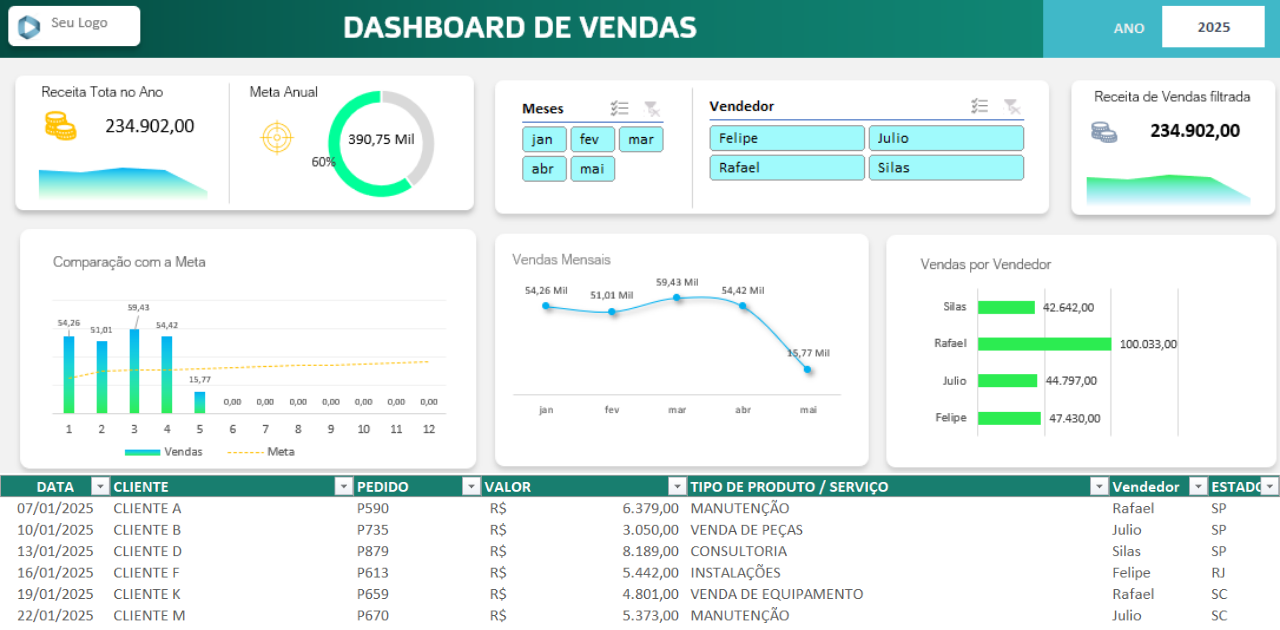 O Dashboard Painel de Vendas em Excel funciona como uma central de comando. Permite que gestores monitorem metas, identifiquem falhas, acompanhem vendas e tomem decisões mais assertivas com base em dados atualizados e confiáveis.