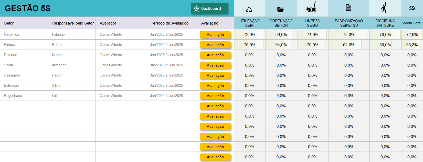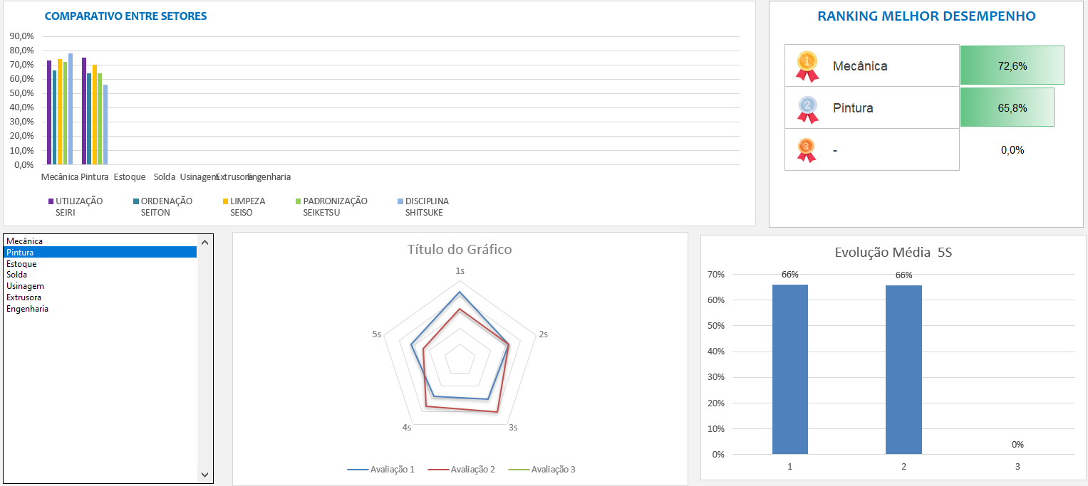 Aplique o 5S com eficiência! Com a Planilha Avaliação 5S, você avalia até 20 setores, gera relatórios automáticos e acompanha a evolução com dashboards práticos e visuais.