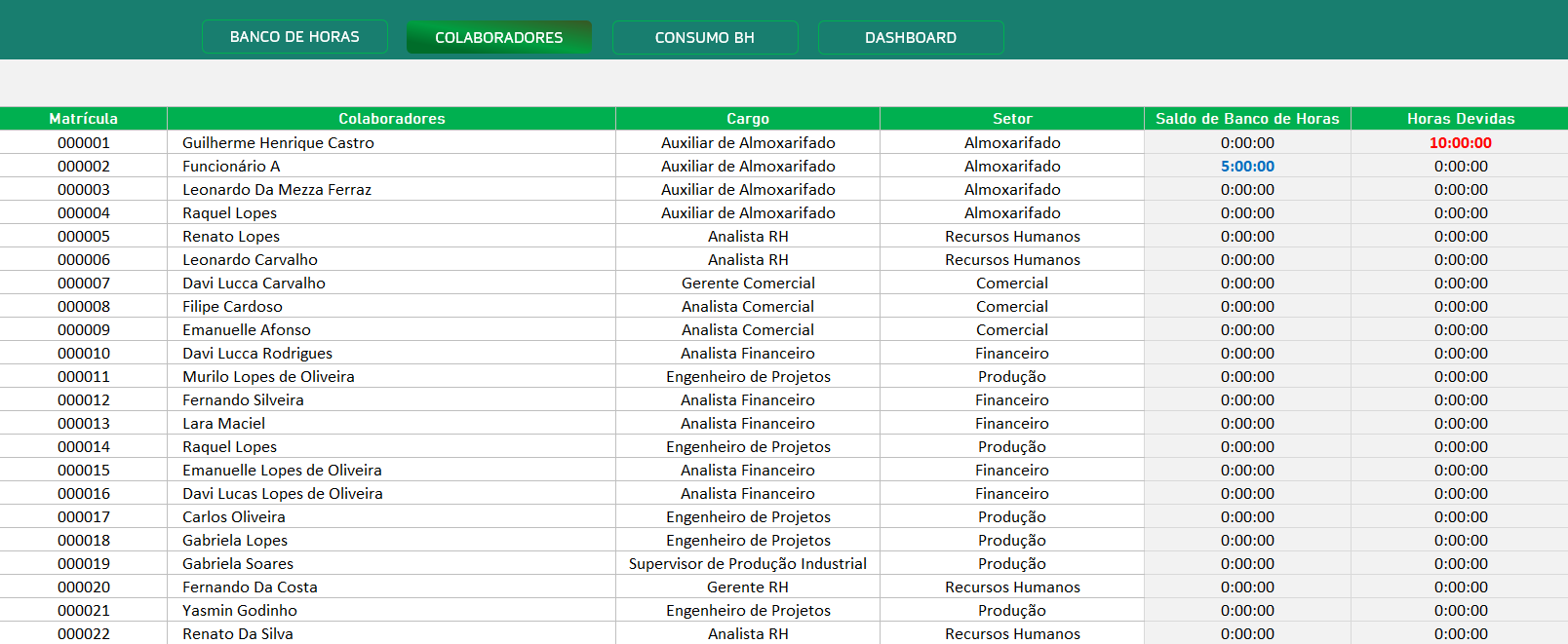 • Cadastro de Colaboradores: registre dados como matrícula, cargo, setor e saldo de horas.