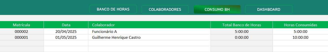 • Registro de Consumo de Horas: controle quando e quanto cada colaborador utilizou do seu banco de horas.