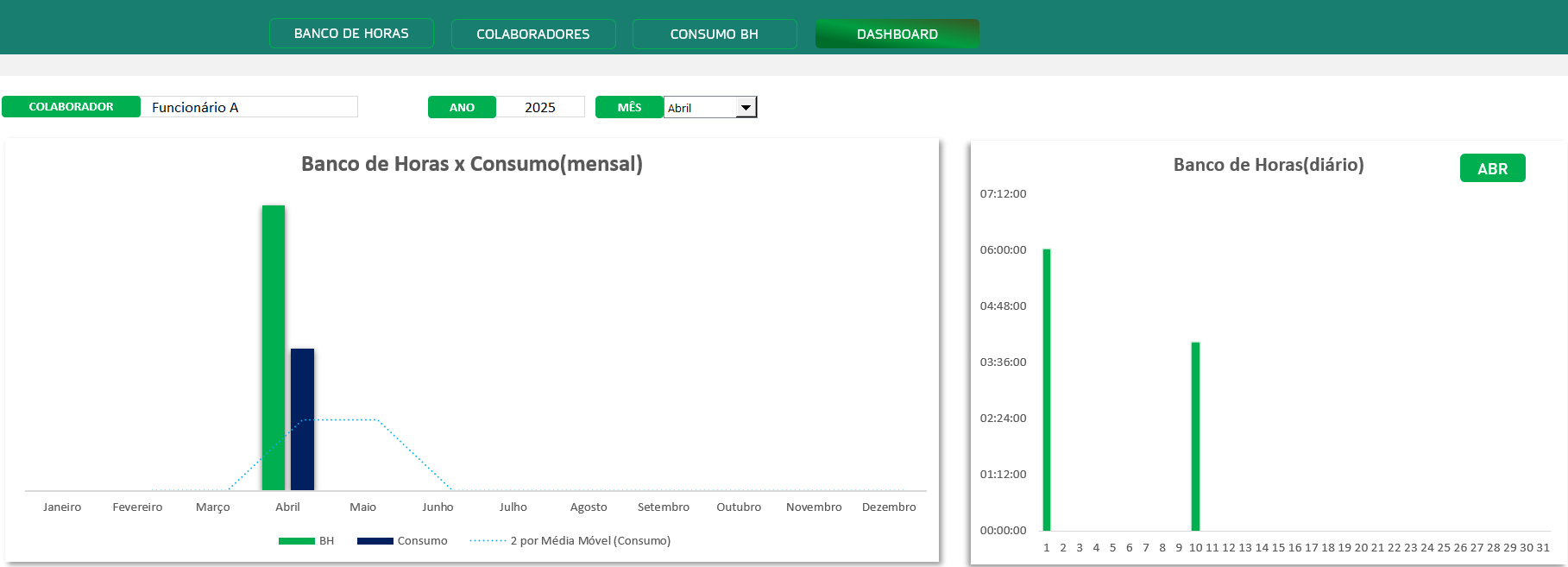 • Dashboard Interativo: visualize de forma clara e gráfica o total de horas acumuladas e consumidas, com filtros por nome, mês e ano.