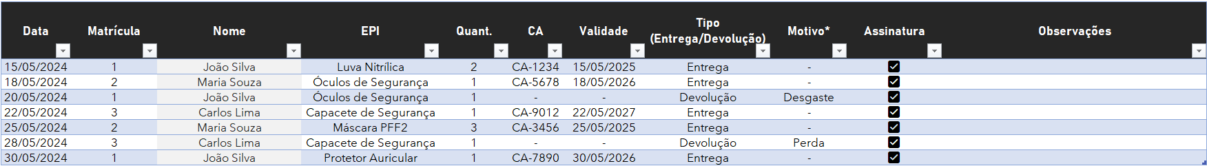 – Controle de entrega e troca dos EPIs: A planilha permite que você registre as datas de entrega e troca dos equipamentos, garantindo que todos estejam em dia com a proteção adequada.