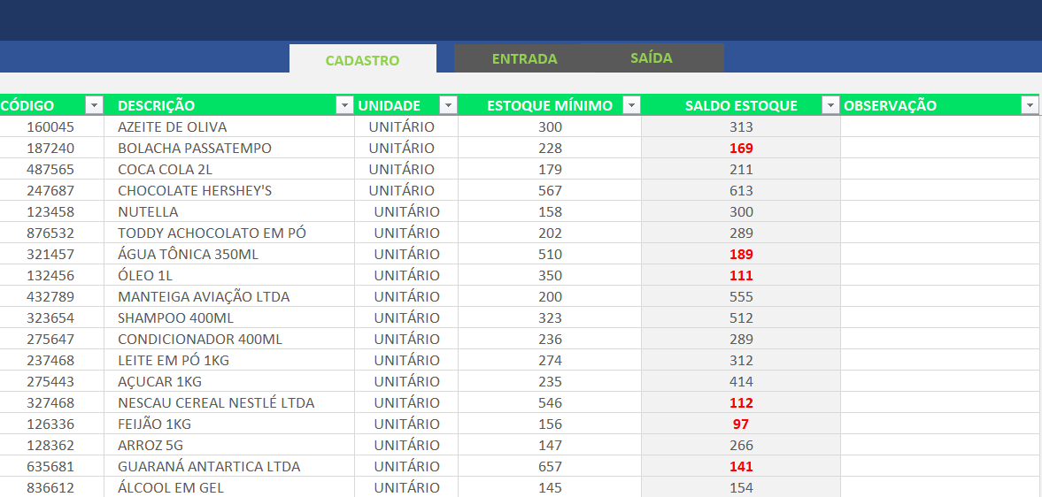 – A planilha possui uma funcionalidade que mostra o estoque atual de cada produto, evitando surpresas desagradáveis como a falta de um item importante para o seu negócio.