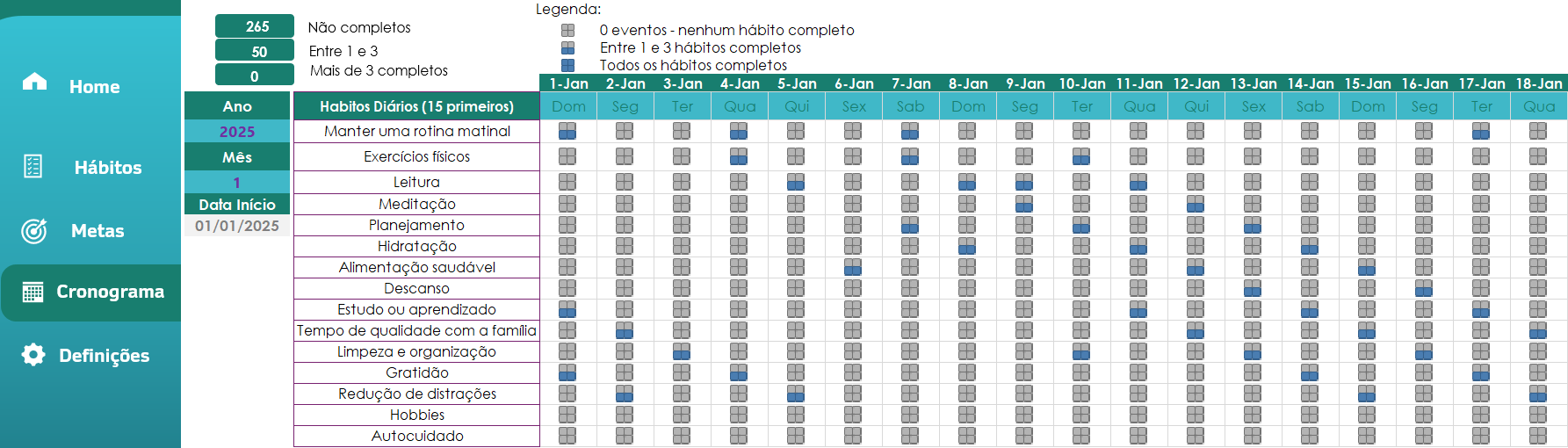 Ao longo do ano, você pode definir até 11 metas por mês, de janeiro a dezembro. A planilha também oferece um cronograma completo para controlar até 15 hábitos principais por mês, o que permite uma visão clara e objetiva do seu rendimento com o passar do tempo.