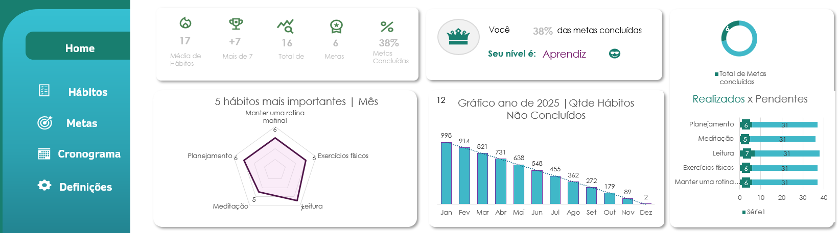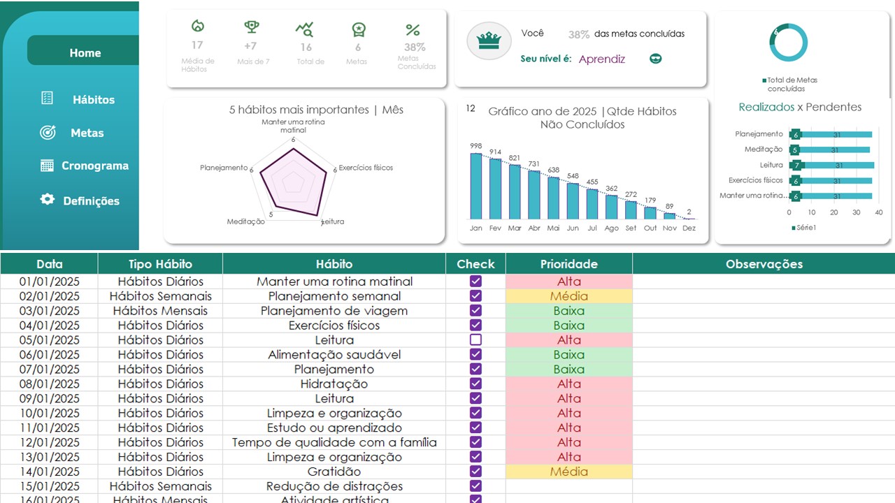 Acompanhe seus hábitos, mantenha o foco e alcance suas metas com uma ferramenta visual, simples e poderosa para transformar sua rotina com consistência.