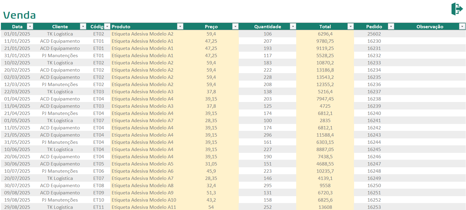Aqui, você registra cada venda com detalhes como data, nome do cliente, código do produto, quantidade e número do pedido. As informações ficam organizadas e disponíveis para consulta sempre que necessário, sem complicações.