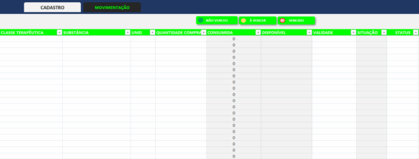 A planilha possui diversas funcionalidades que facilitam a gestão e organização desses produtos. Ela permite registrar dados como nome do medicamento, posologia, data de validade, quantidade disponível e datas de uso, facilitando a visualização e o controle de estoque.
