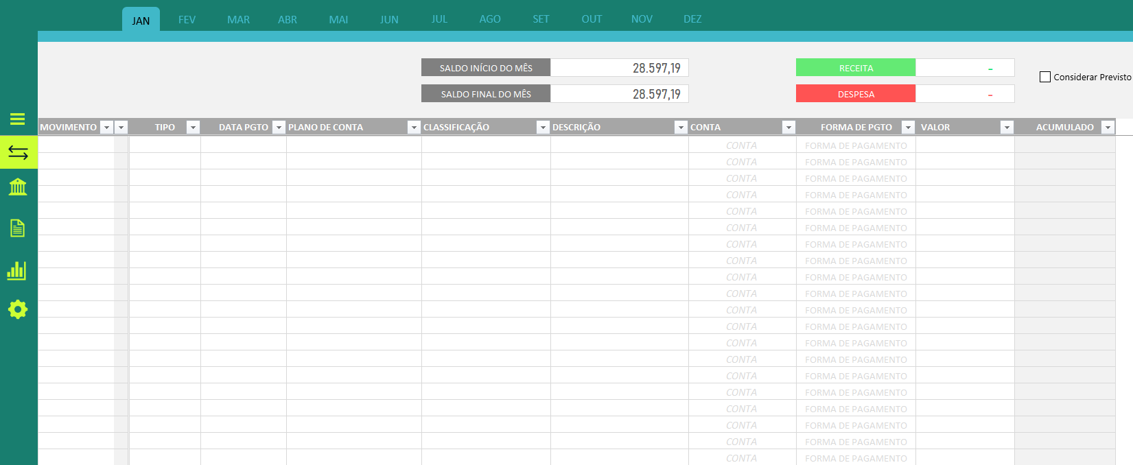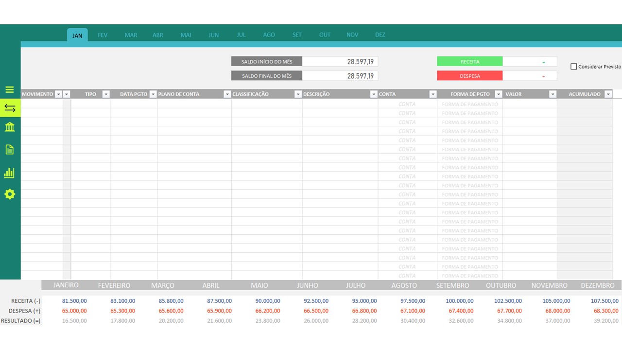Na aba Definições, você insere os parâmetros básicos, como contas, formas de pagamento e o saldo inicial. Sendo assim, esse passo é importante para garantir que todos os cálculos estejam corretos ao longo do uso.