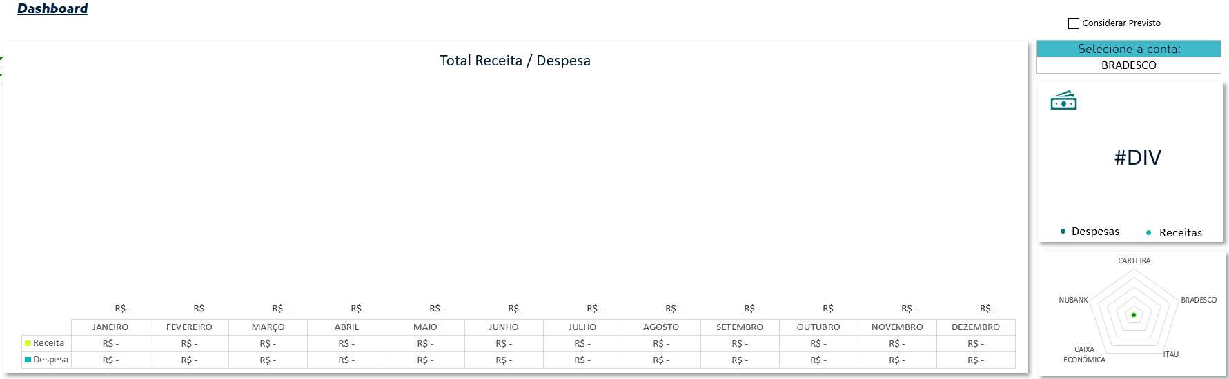 Já em Relatórios, a planilha oferece análises completas. Você pode acompanhar os valores previstos e realizados, comparar resultados, visualizar as diferenças entre eles e filtrar por categorias específicas. Isso facilita tanto a avaliação mensal quanto a revisão estratégica do negócio.