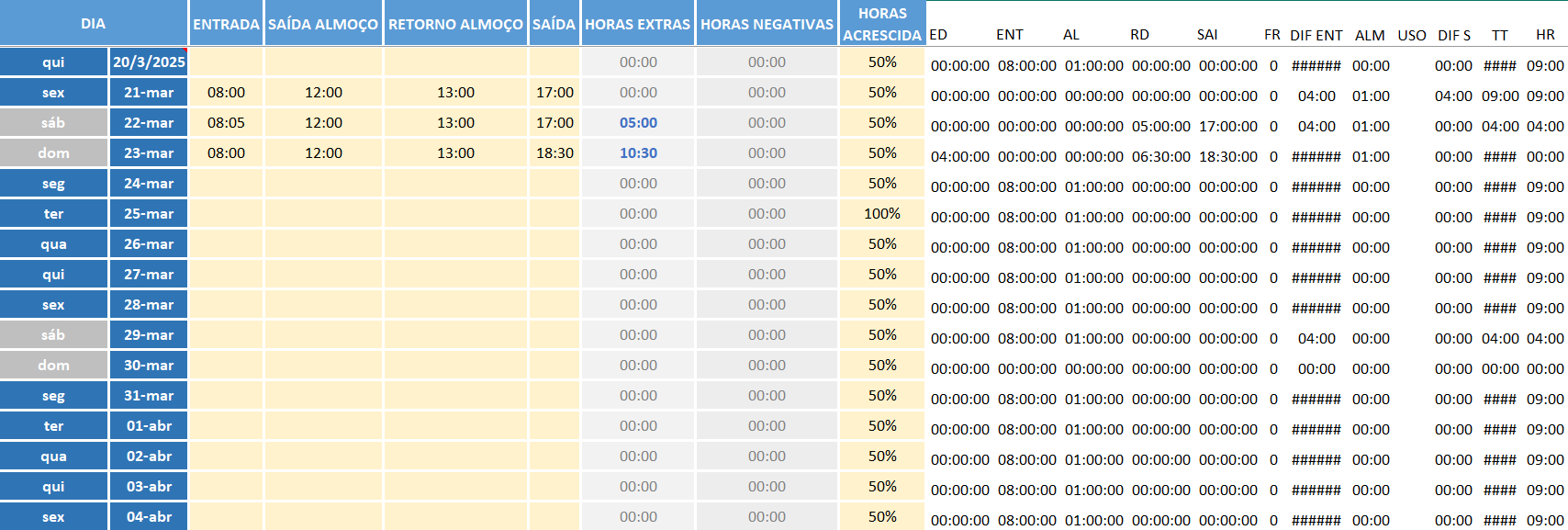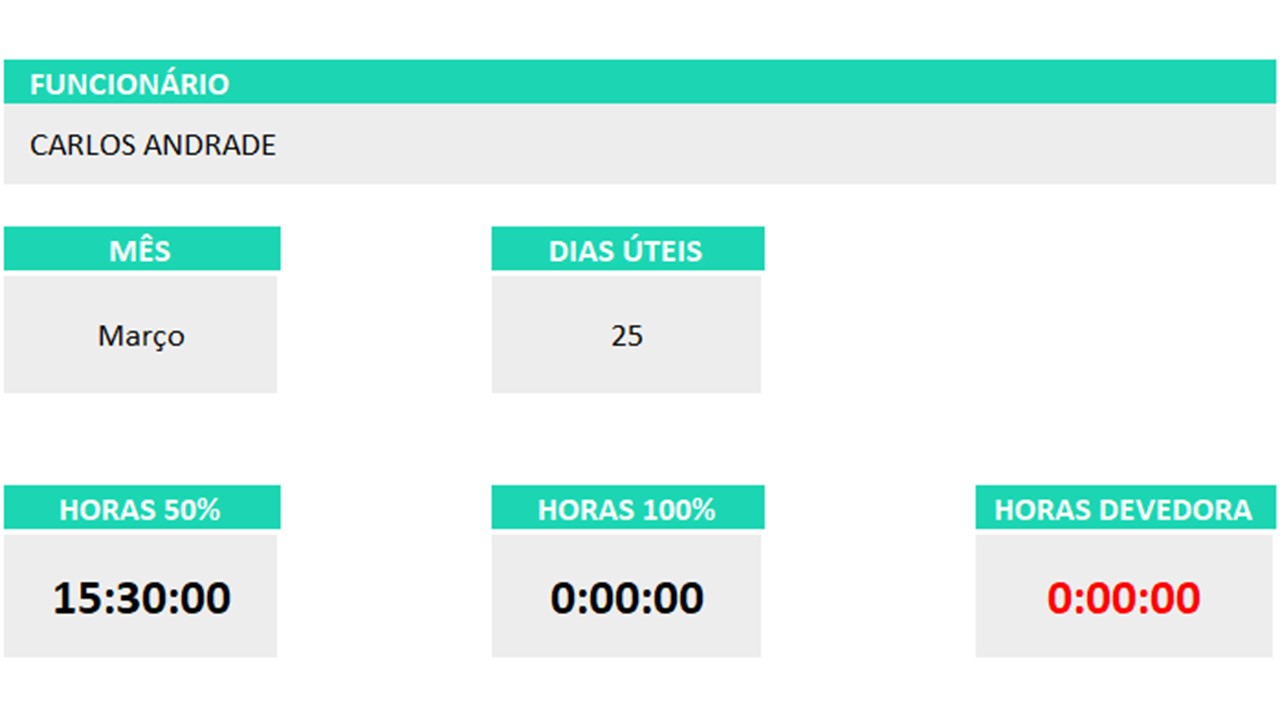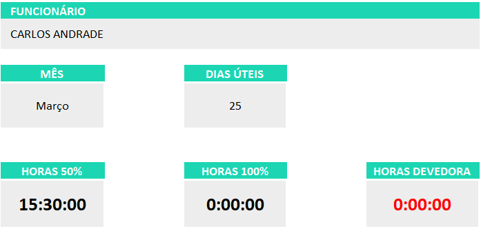 • Lançamento do Ponto: registre as marcações diárias. A planilha calcula automaticamente atrasos, horas extras e devedoras.