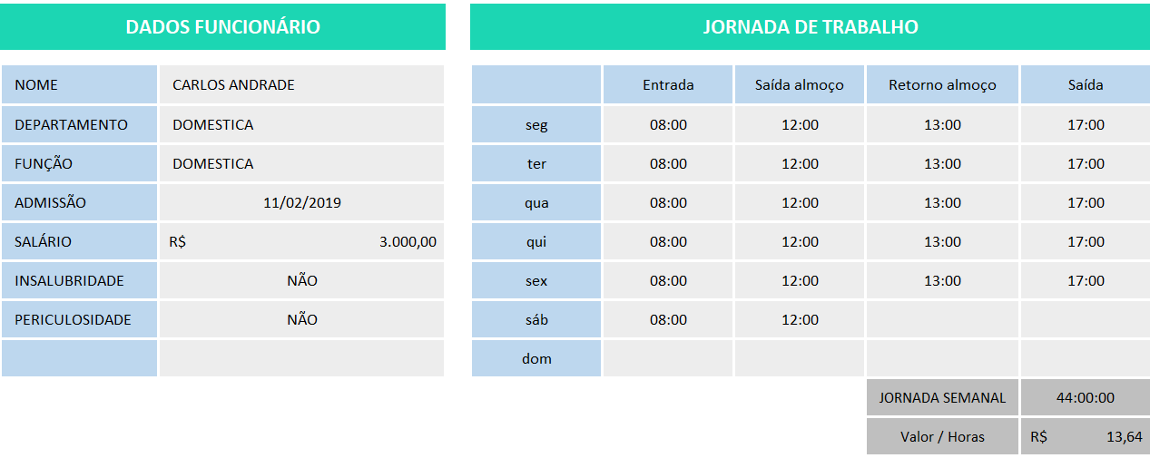 • Funcionários: cadastre nome, função, salário, data de admissão, direitos especiais (como insalubridade ou periculosidade) e a jornada semanal individual.