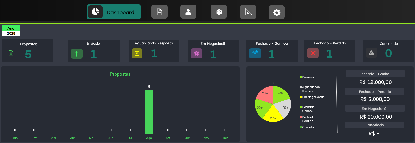 Na aba “Propostas”, você registra todos os detalhes importantes: número de identificação, nome do cliente, empresa, valor, data de envio, tipo de serviço ou produto, status da negociação e muito mais. Cada campo foi pensado para tornar sua rotina mais prática e garantir que nenhum dado fique de fora.