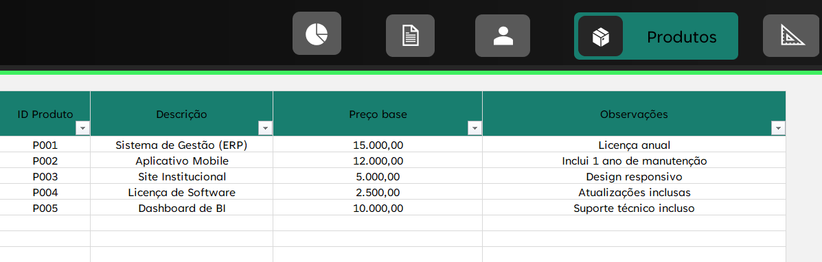 Além disso, a Planilha de Propostas Comerciais conta com áreas específicas para o cadastro de clientes, produtos e serviços. Isso elimina retrabalho, agiliza novos cadastros e mantém todas as informações centralizadas.