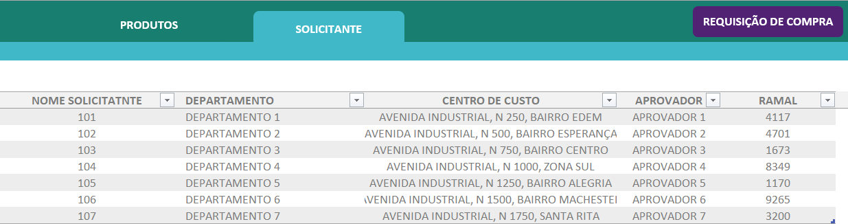 Logo ao abrir a planilha, o usuário acessa a área de cadastro de produtos e solicitantes e insere dados como código do item, descrição, valor unitário e unidade de medida. Já no cadastro de colaboradores, é possível incluir informações do solicitante, setor, centro de custo, ramal e responsável pela aprovação. Tudo isso de forma intuitiva, com campos claros e bem organizados.