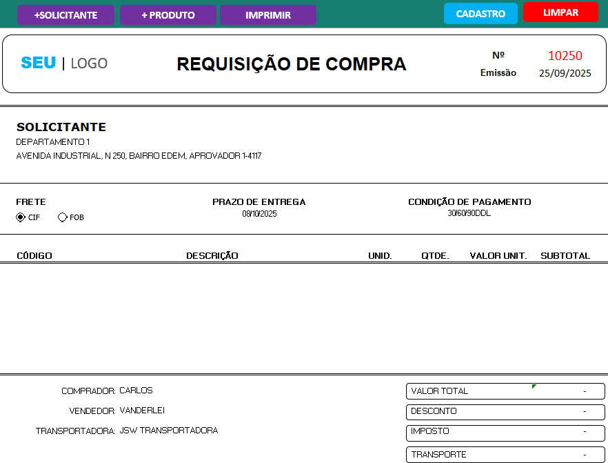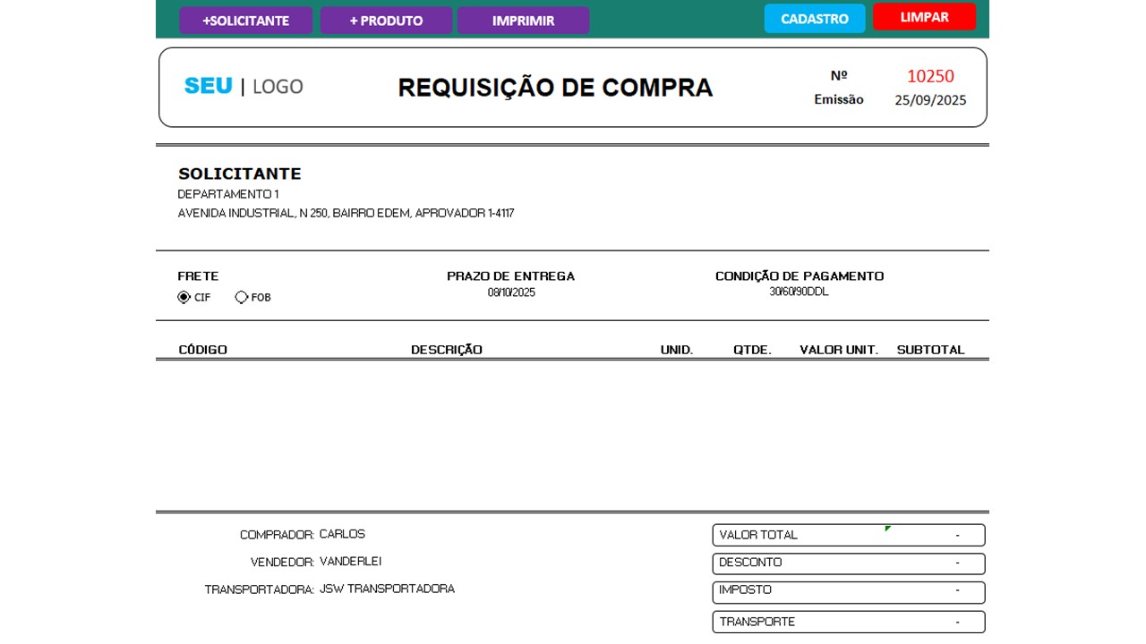 Nesse sentido, ao preencher a requisição de compra, os dados são puxados automaticamente do cadastro, tornando o processo ágil e minimizando erros manuais. Além disso, a Planilha de Requisição de Material de Compra permite incluir detalhes importantes como data de emissão, número da requisição, descontos, impostos, transporte, valor total e observações adicionais. E o melhor: ao final, o usuário gera uma versão impressa ou digital da requisição, pronta para aprovação e envio ao setor de compras.
