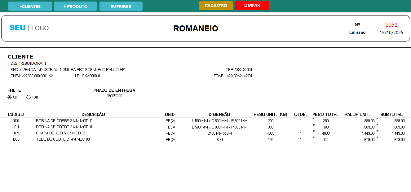 Após realizar os cadastros, você preenche o romaneio de forma rápida. Nesse sentido, basta buscar os produtos e clientes já registrados, selecionar as quantidades e a planilha calcula automaticamente o total dos itens, o valor final e o número de volumes.