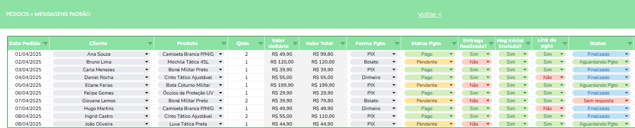 A planilha também conta com modelos de mensagens prontas, ideais para agilizar a comunicação no dia a dia. Nesse sentido, você pode usar textos de confirmação de pedido, lembrete de pagamento ou aviso de envio, mantendo a agilidade sem perder a personalização no atendimento.