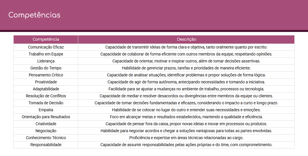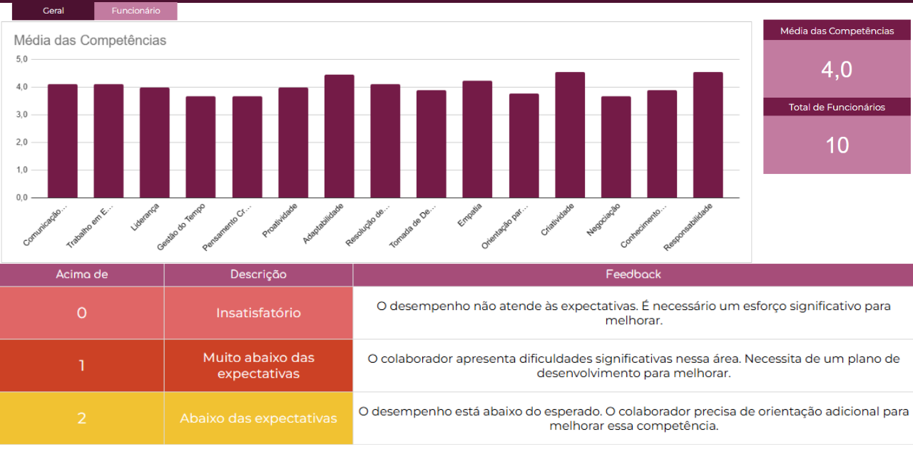 Na aba Critérios de Avaliação, é possível atribuir notas, descrever observações e registrar comentários personalizados para cada colaborador. Já na seção Competências, você define as habilidades a serem avaliadas, como comunicação, trabalho em equipe, proatividade e liderança. Nesse sentido, essa estrutura garante uma análise completa e justa do desempenho de todos.