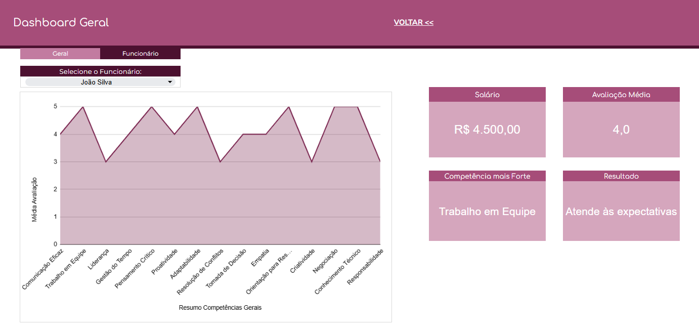 O Dashboard oferece uma visão global do desempenho da empresa. Sendo assim, gráficos dinâmicos mostram os resultados individuais e coletivos, ajudando a identificar rapidamente onde estão os destaques e os pontos que precisam de atenção.