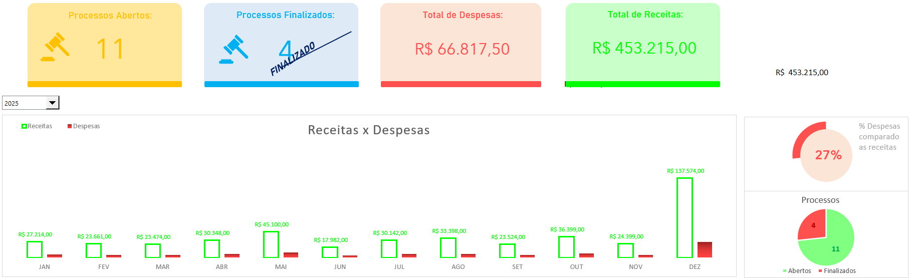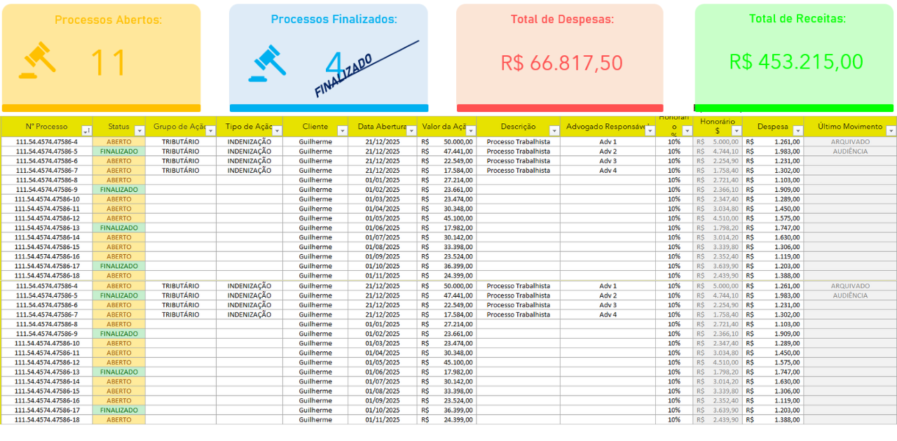 Desse modo, gerenciar processos manualmente, porém, pode ser complicado e abrir espaço para erros ou esquecimentos. Por isso, a Planilha para Advogado em Excel surge como uma solução prática e eficiente. Ela vai muito além de simples tabelas, oferecendo recursos que organizam, monitoram e analisam todos os processos, despesas e receitas associados. Ou seja, com essa ferramenta, você tem visibilidade completa e consegue gerenciar cada detalhe de forma estruturada.