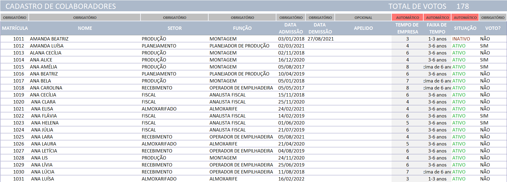 Em seguida, o cadastro de colaboradores armazena dados completos de cada funcionário, incluindo setor, função, tempo de empresa e status de participação. Nesse sentido, a planilha ainda oferece automações inteligentes que preenchem alguns campos automaticamente, agilizando o trabalho.