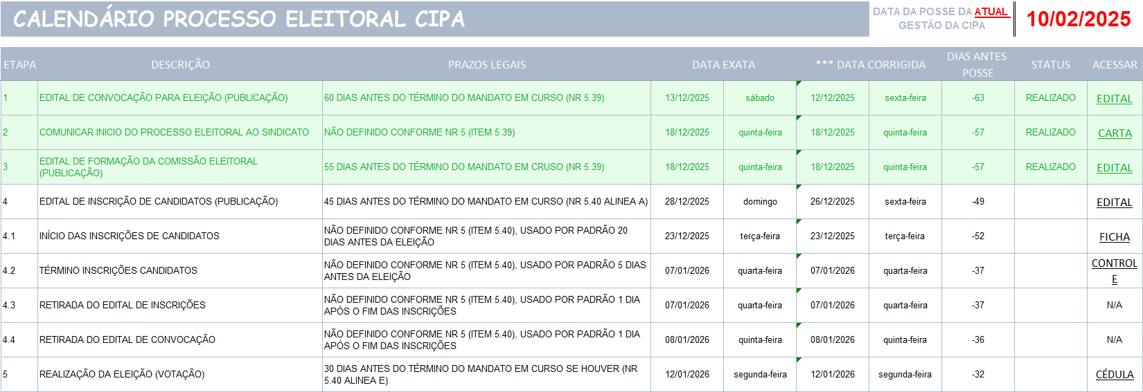 Por fim, como complemento, a planilha também conta com áreas dedicadas ao Calendário do Processo Eleitoral, Reuniões, Inspeções e Definições, tornando a gestão ainda mais completa.