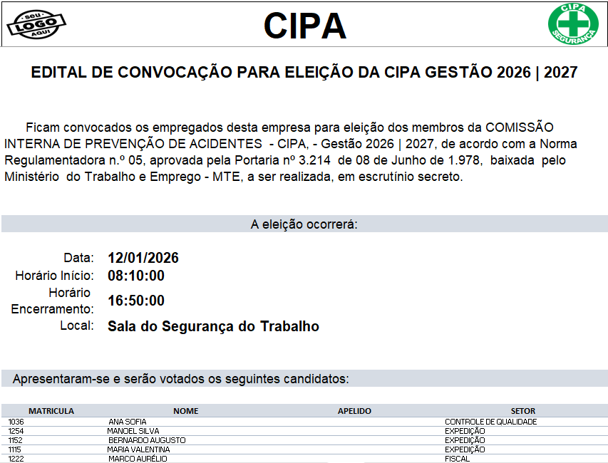 Logo na aba inicial, é possível registrar as informações cadastrais da empresa, como CNPJ, endereço, CNAE, grau de risco e número de colaboradores. Também há espaço para listar os membros efetivos e suplentes da CIPA, garantindo total transparência na composição da comissão.