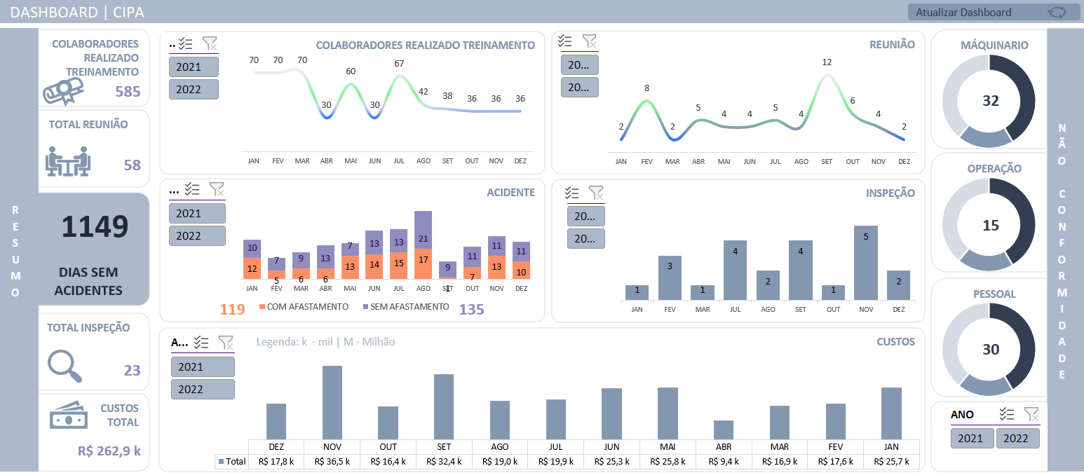 Além disso, há abas específicas para Não Conformidades e Custos, que ajudam a identificar falhas e monitorar gastos relacionados à segurança do trabalho. Todos esses dados alimentam o Dashboard, que apresenta gráficos e indicadores de desempenho, como número de treinamentos realizados, dias sem acidentes e custos totais.
