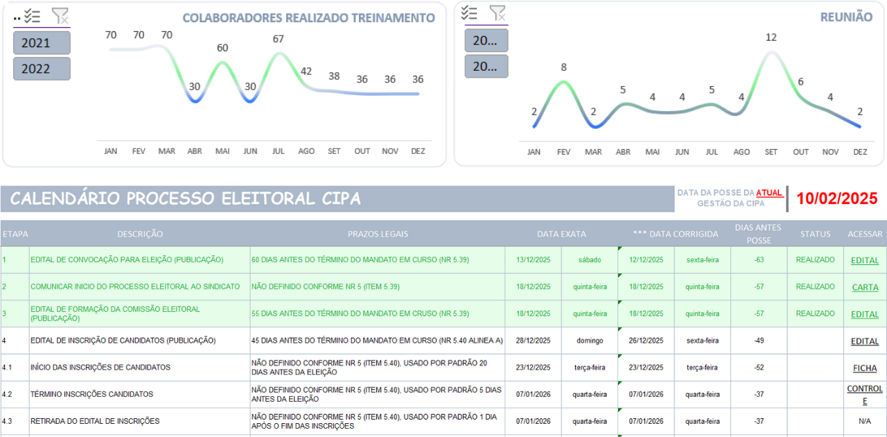 Desse modo, voltada para profissionais de segurança, gestores de RH e membros da CIPA, essa planilha permite controlar desde o cadastro da empresa e dos colaboradores até treinamentos, acidentes, inspeções e reuniões. Tudo fica centralizado em um só lugar, com atualizações automáticas e relatórios visuais que facilitam o acompanhamento das ações.
