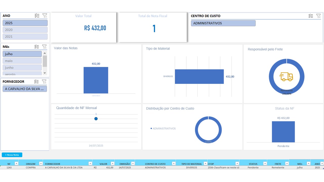 Registre e acompanhe notas fiscais com mais agilidade e precisão. Com campos automatizados e um dashboard completo, esta planilha permite controle por fornecedor, centro de custo, tipo de material, status da nota e muito mais. Organize suas compras, evite erros e tome decisões com base em dados reais.