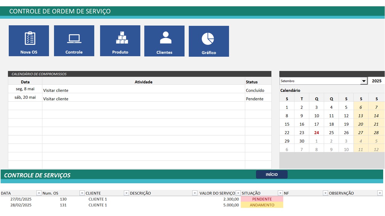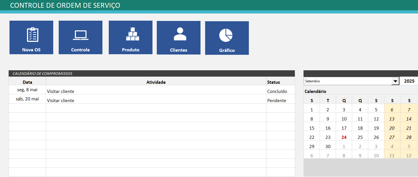 Principais recursos da Planilha para Controle de Ordem de Serviços