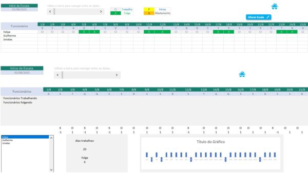 Dessa forma, com uma boa planilha, você consegue visualizar de forma clara quem está trabalhando, quem está de folga e quem está afastado em qualquer dia da semana. Além disso, é possível planejar turnos com antecedência, fazer alterações pontuais e acompanhar todas as movimentações da equipe. Isso evita falhas de comunicação e melhora a rotina de setores como RH, gestão e liderança.